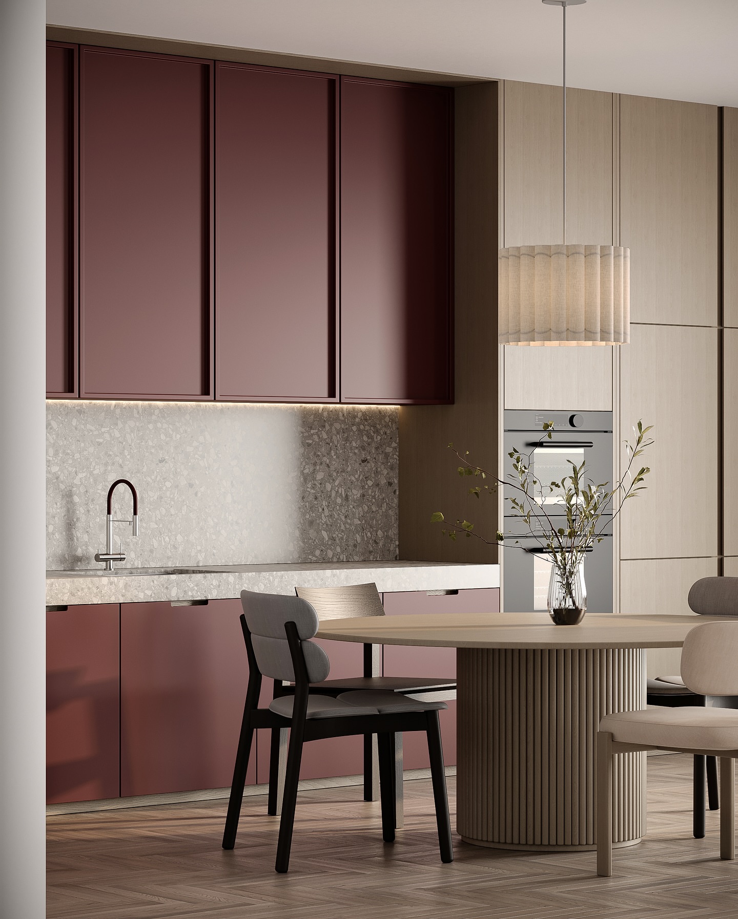 در این پلن، تمرکز اصلی بر روی نمای کلی و چیدمان منطقی فضا است. ابتدا پلان اولیه کابینتها طراحی میشود و سپس با توجه به ابعاد واقعی آشپزخانه، مدل سهبعدی با نرمافزارهای تخصصی ساخته میشود. در ادامه، رنگها و متریالها با ترکیبهای پایه انتخاب میشوند تا بتوانید حس واقعی از ترکیب اجزای فضای خود به دست آورید.